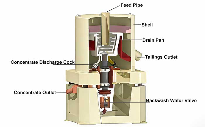 Knelson centrifugal concentrator mainly consists of a feed pipe, frame, tailings launder, double-layer centrifugal barrel, drive motor, vertical shaft and other components.