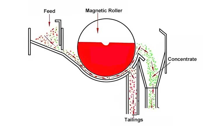After the ore pulp flows into magnetic separator through the feeding trough, the ore particles enter the tank in a loose state under the action of water flow from the feeding water spray pipe. Magnetic ore particles undergo magnetic agglomeration to form “magnetic clusters” or “magnetic chains”. Driven by magnetic force in the ore pulp, these “magnetic clusters” or “magnetic chains” move towards the magnetic poles and are adsorbed on the cylinder to form concentrate.