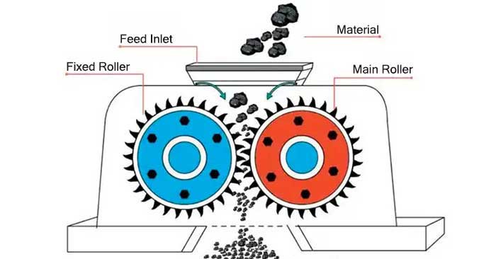 Power from two electric motors is transmitted through a reducer to drive two parallel-mounted toothed rollers to rotate in opposite directions respectively. When materials fall into the gap between the two rollers of the roller crusher, the spiral teeth or blade-shaped tooth plates first screen the materials. Particles smaller than the discharge size pass through directly without being crushed and enter the discharge chute. Under the combined action of vertical stress and shear force, large materials are crushed by the splitting, shearing and stretching of the roller teeth, and then discharged from the discharge port.