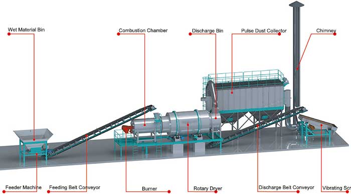 The third level drying area is a normal drying area with an indoor temperature of 120 ℃ -210 ℃. It uses crushing equipment inside the drum to repeatedly pull, hit, and scatter, and dries downstream;