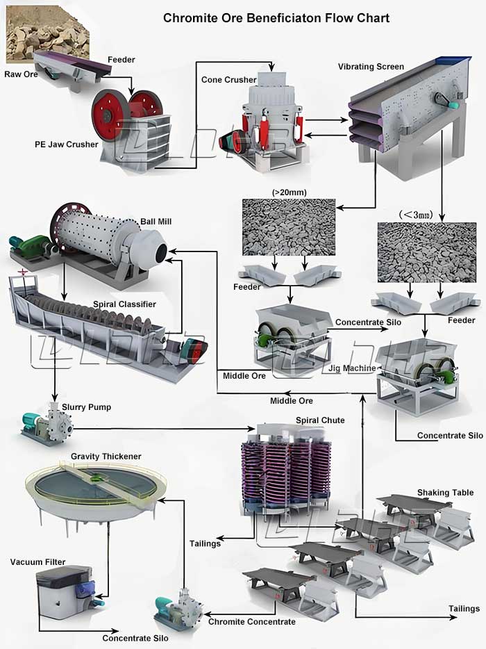Summary: Chrome ore beneficiation process consists of a complete set of procedures including crushing, grinding, classification, separation and dewatering. Each procedure is equipped with corresponding equipment. Proper selection of beneficiation equipment can achieve maximum economic benefits.