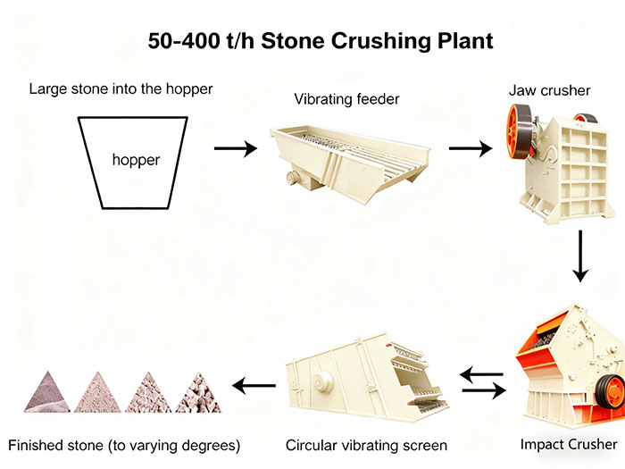 Stone crushing plant mainly comprises vibrating feeder, jaw crusher, impact crusher, vibrating screen, conveying equipment, and electrical control system. Optional configurations may include cone crusher or sand maker based on site requirements.